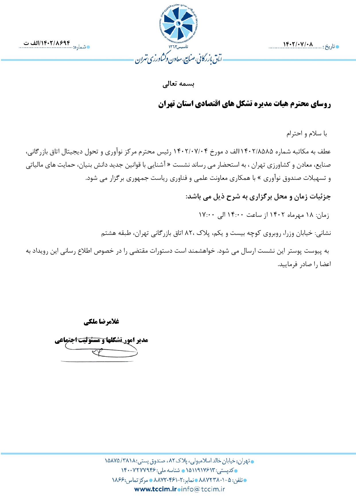 نشانی: خیابان وزرا، رو به روی کوچه 21، پلاک 82، اتاق بازرگانی تهران، طبقه 8