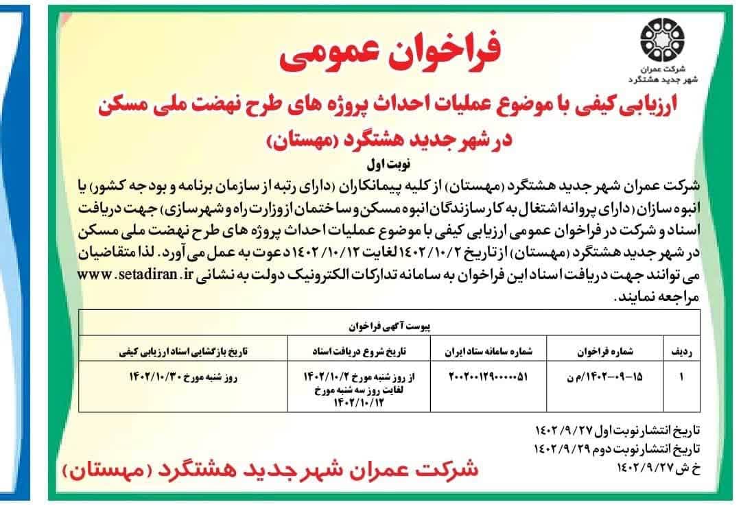 پروژه های طرح نهضت ملی مسکن فراخوان عمومی ارزیابی کیفی با موضوع عملیات احداث پروژه های طرح نهضت ملی مسکن در شهر جدید هشتگرد(مهستان) ۱۰ دی ۱۴۰۲ میانگین امتیاز کاربران: 0.0 (0 رای) 12345 برای نظر دادن ابتدا باید به سیستم وارد شوید. برای ورود به سیستم روی کلید زیر کلیک کنید. ورود