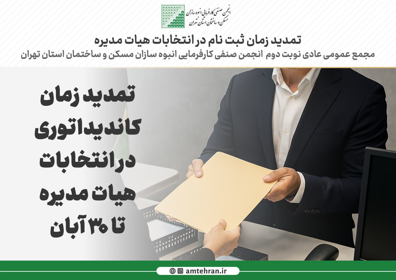 با توجه به برگزاری مجمع عمومی عادی نوبت دوم انجمن صنفی کارفرمایی انبوه سازان مسکن و ساختمان استان تهران در ۱۰ آذر ۱۴۰۴، داوطلبان علاقمند برای ثبت نام در انتخابات هشتمین دوره هیات مدیره انجمن تا ۳۰ آبان فرصت دارند.
