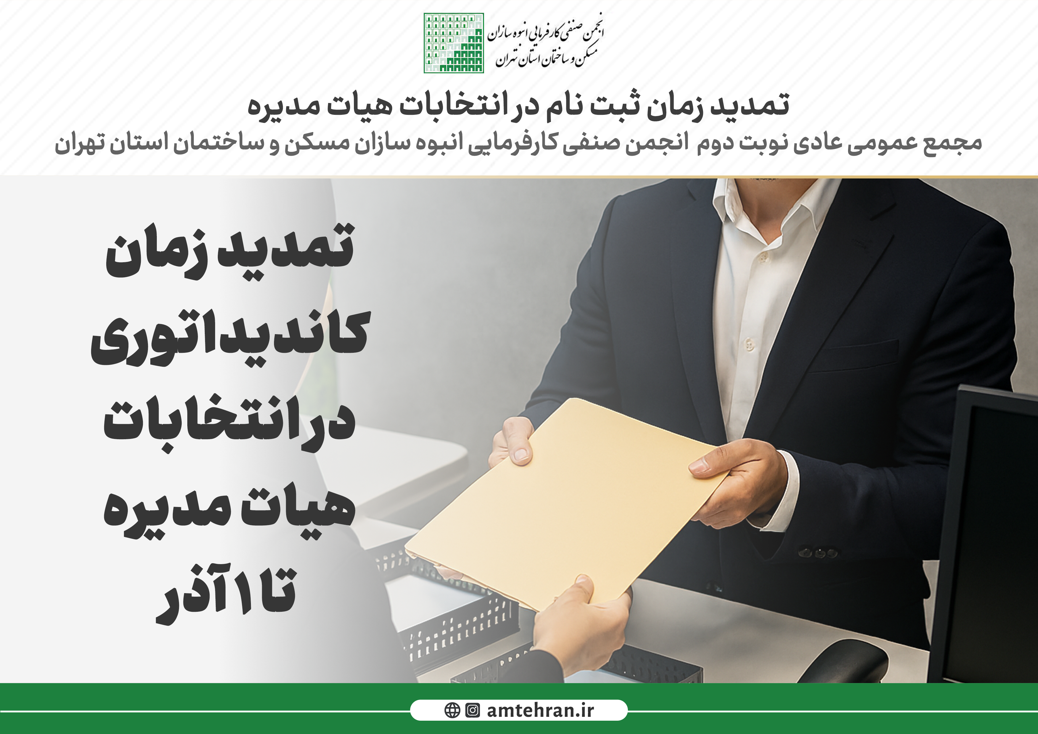 با توجه به برگزاری مجمع عمومی عادی نوبت دوم انجمن صنفی کارفرمایی انبوه سازان مسکن و ساختمان استان تهران در ۱۰ آذر ۱۴۰۴، داوطلبان علاقمند برای ثبت نام در انتخابات هشتمین دوره هیات مدیره انجمن تا 1 آذر فرصت دارند.