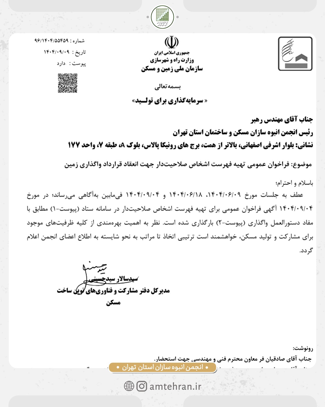 با عنایت به برگزاری جلسات مشترک انجمن انبوه سازان استان تهران با سازمان ملی زمین و مسکن، این سازمان فراخوان عمومی برای تهیه فهرست اشخاص صلاحیت دار برای مشارکت در ساخت مسکن صادر کرده است.